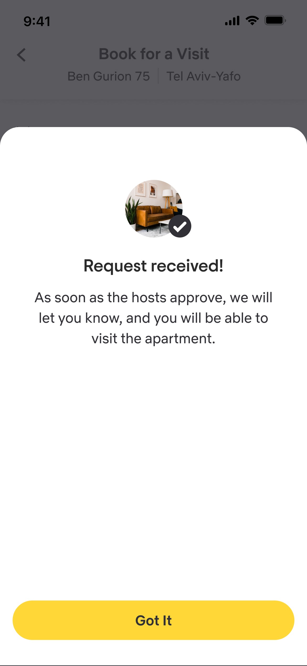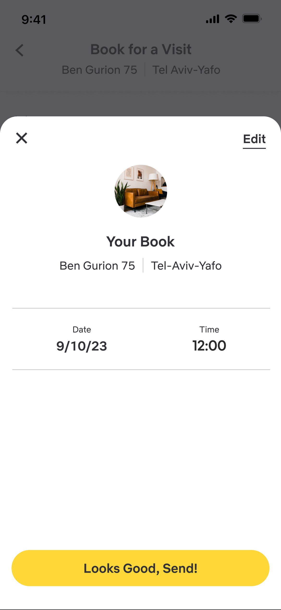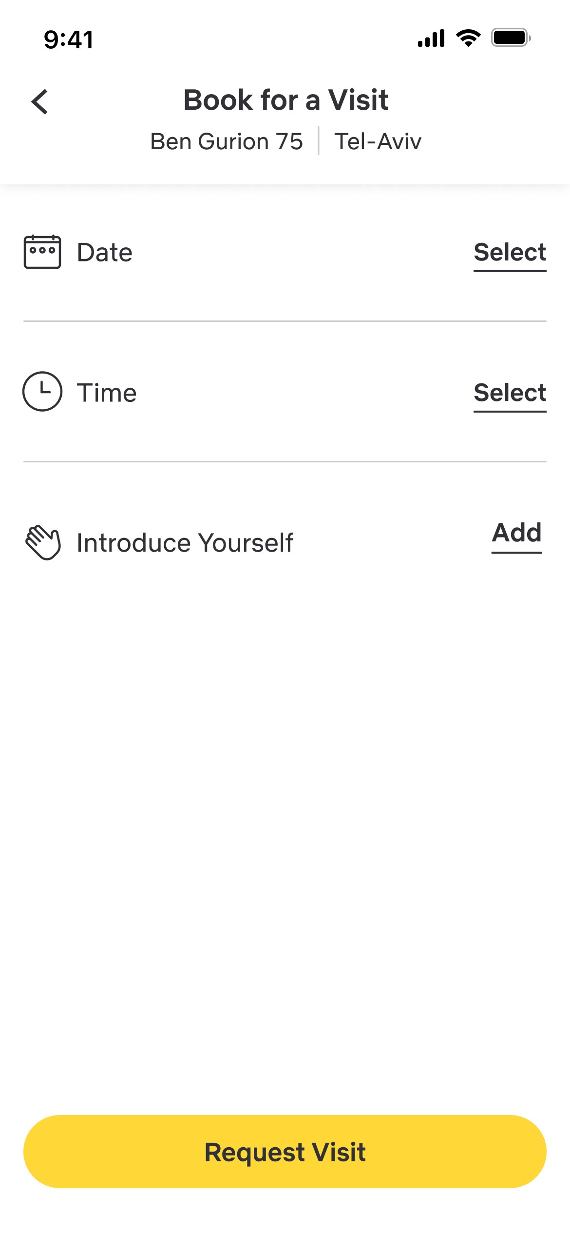 Visits to the apartment require the user to select a time, date, and self background (optional).