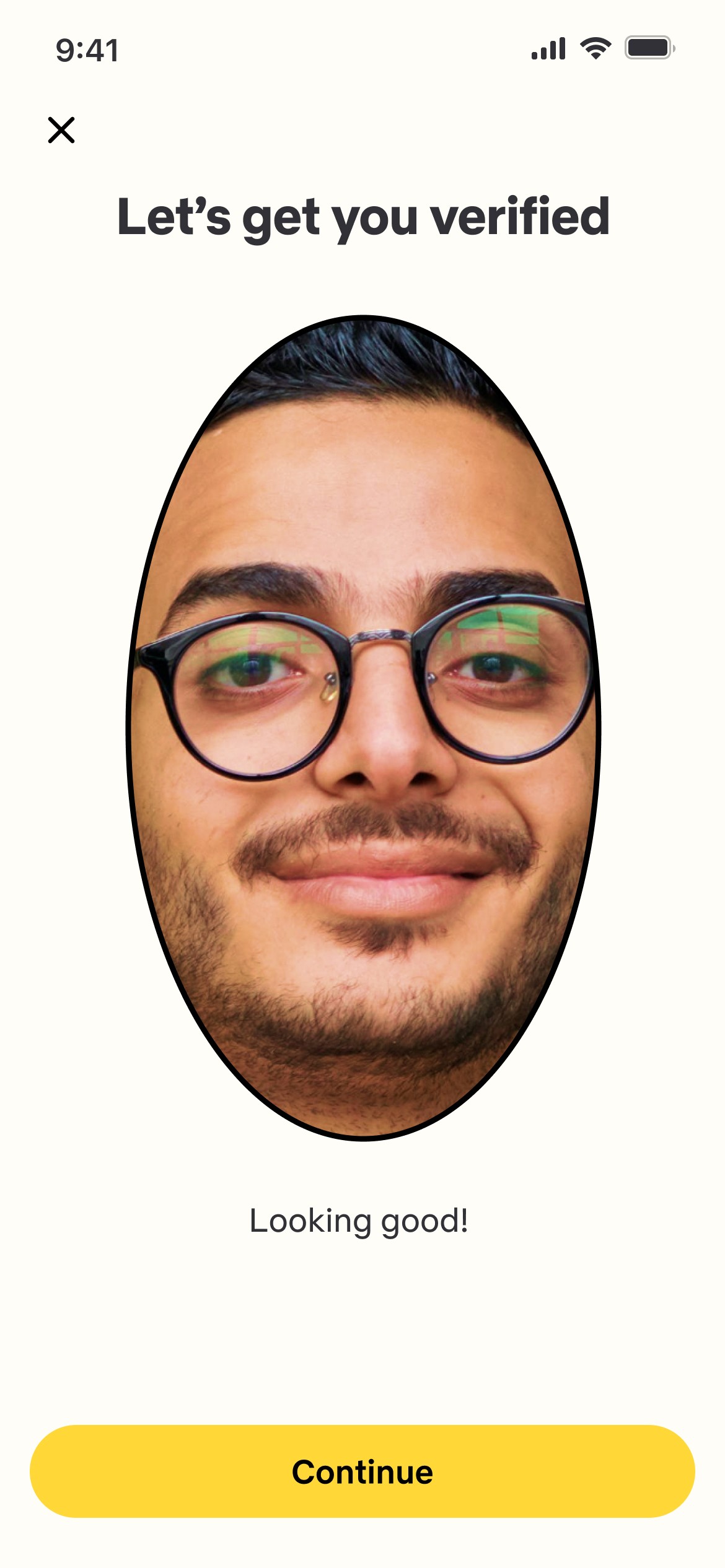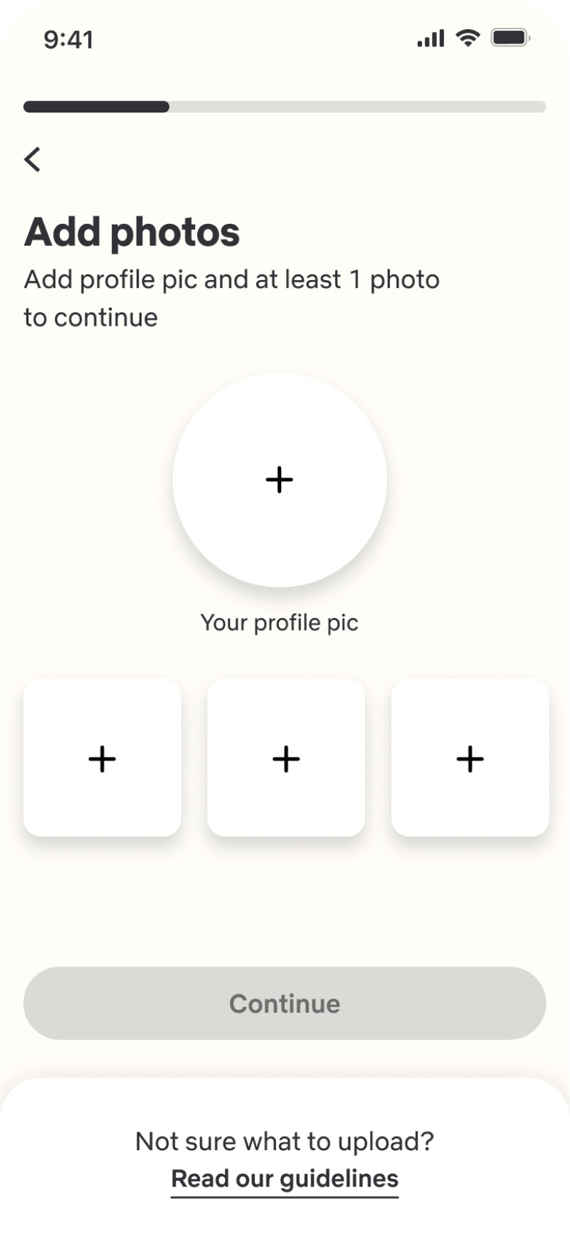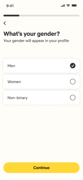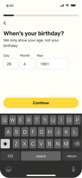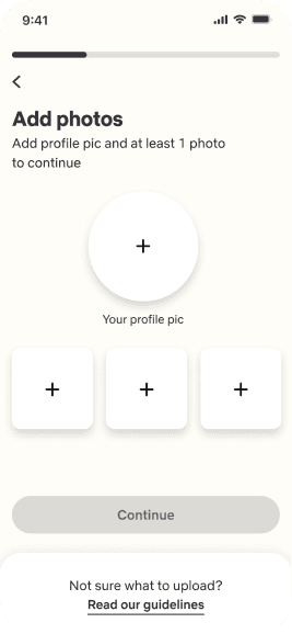The onboarding includes a verification procedure in which he is asked to enter his phone number and add additional details such as name, gender and photos.