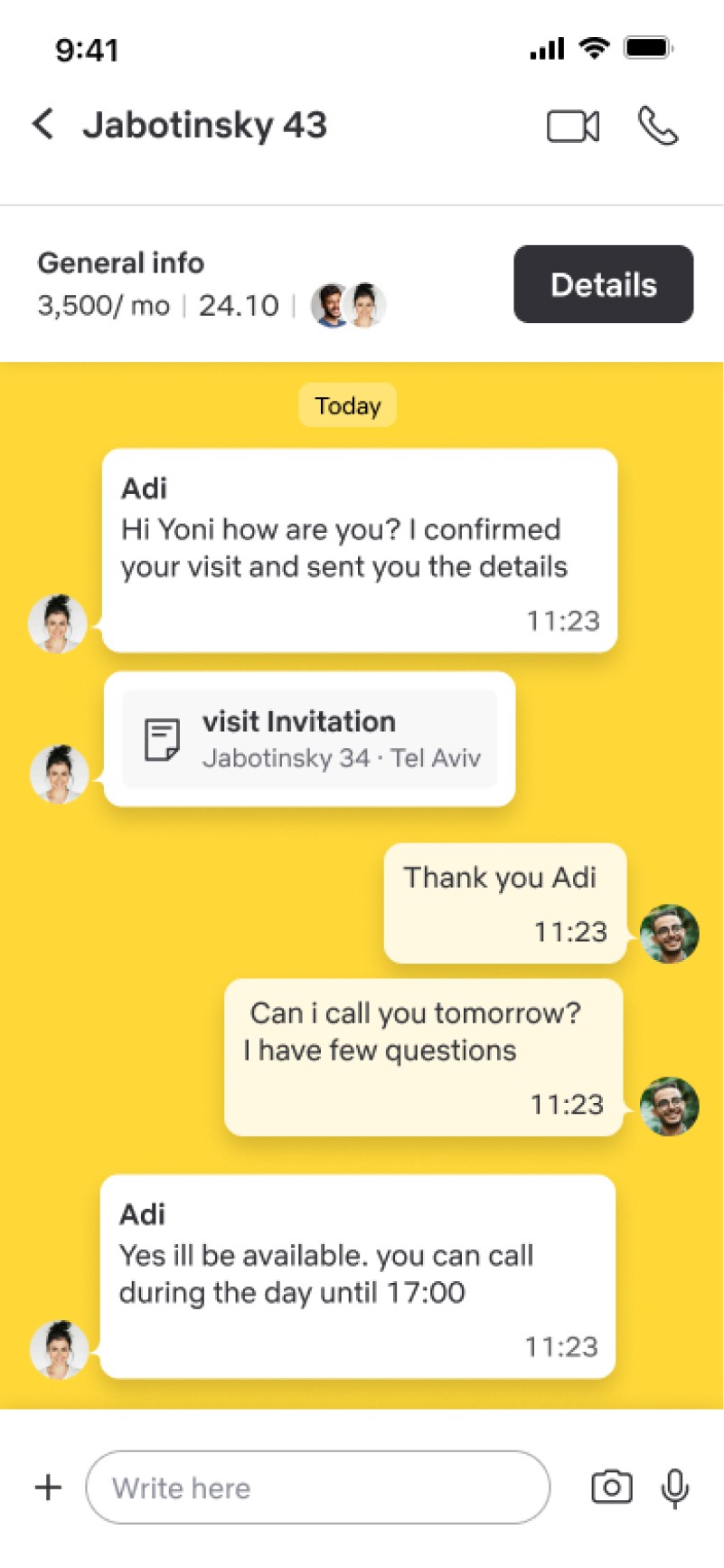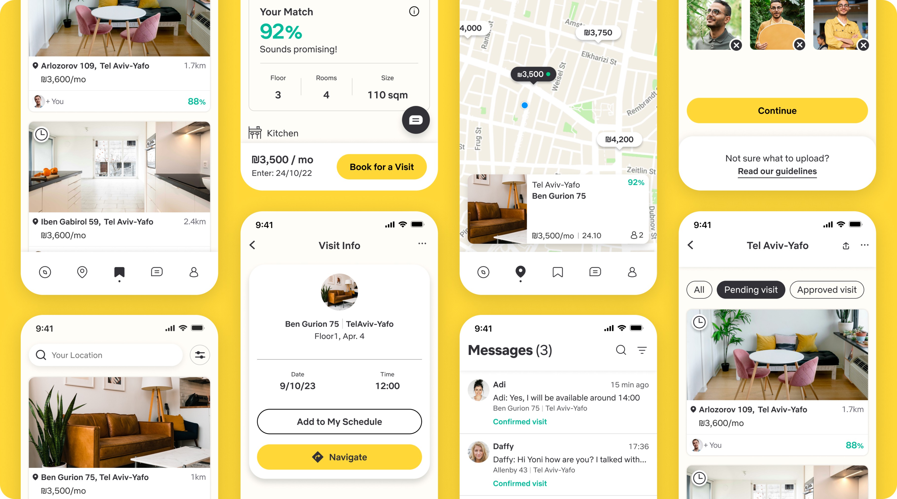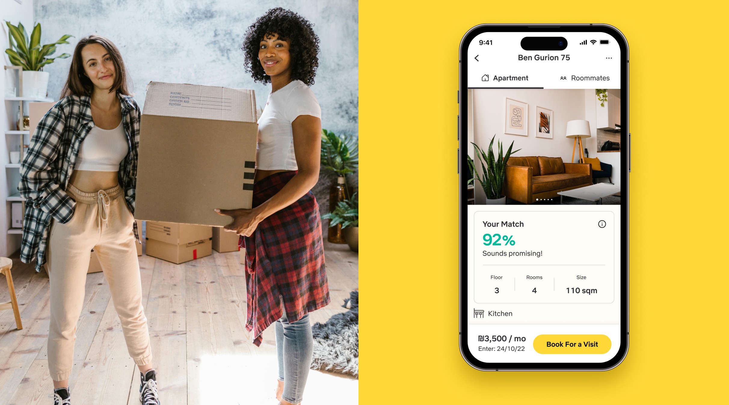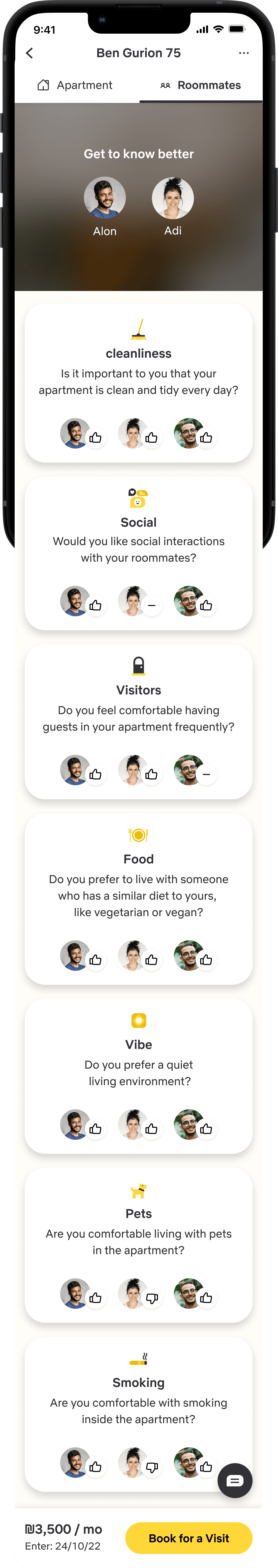 In this screen the user will find comprehensive details such as match percentage (considering both the apartment and its roommates), information about apartment amenities, bills, etc. At the bottom of the screen, there is option to book for a visit in the apartment or ask the tenants any question.