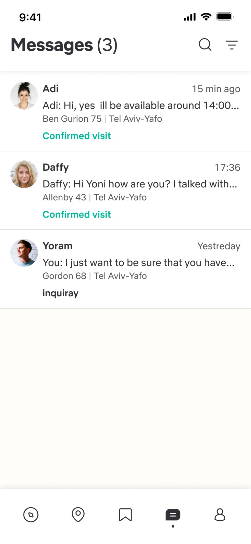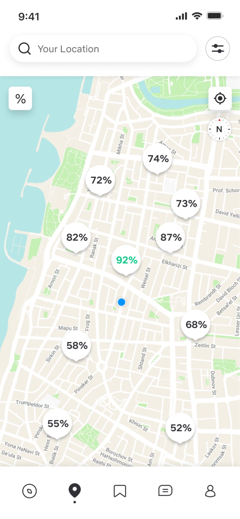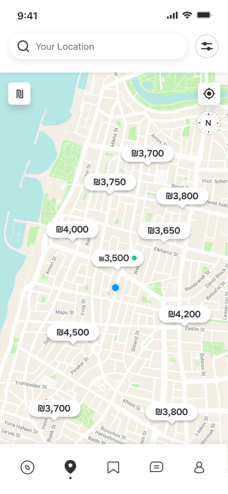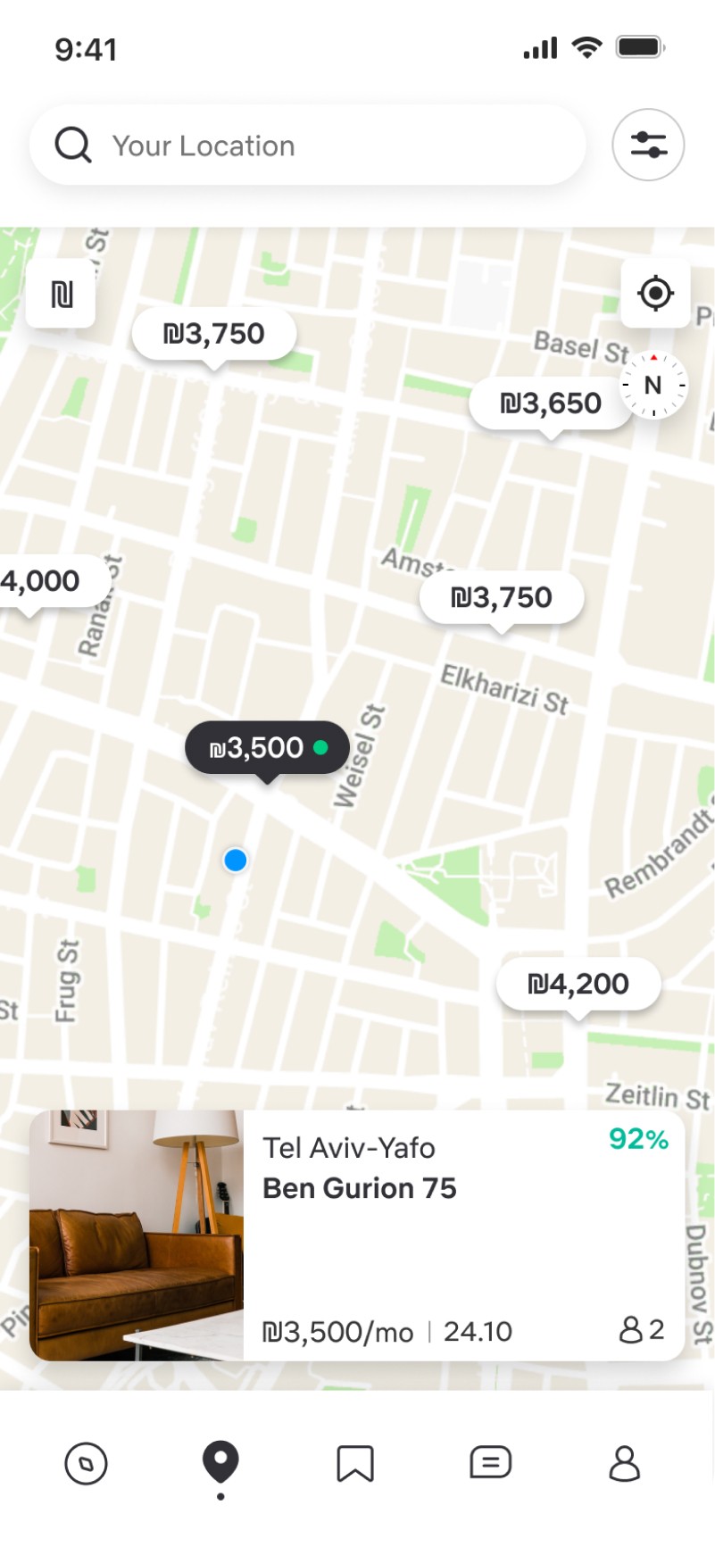 In the Discover screen, the user can view all the apartments near him, including their address, rental price, number of roommates (excluding himself), and matching percentage (taking both the apartment and its roommates into account). He can define another search location in the search field. He can also filter the results to receive more accurate offers