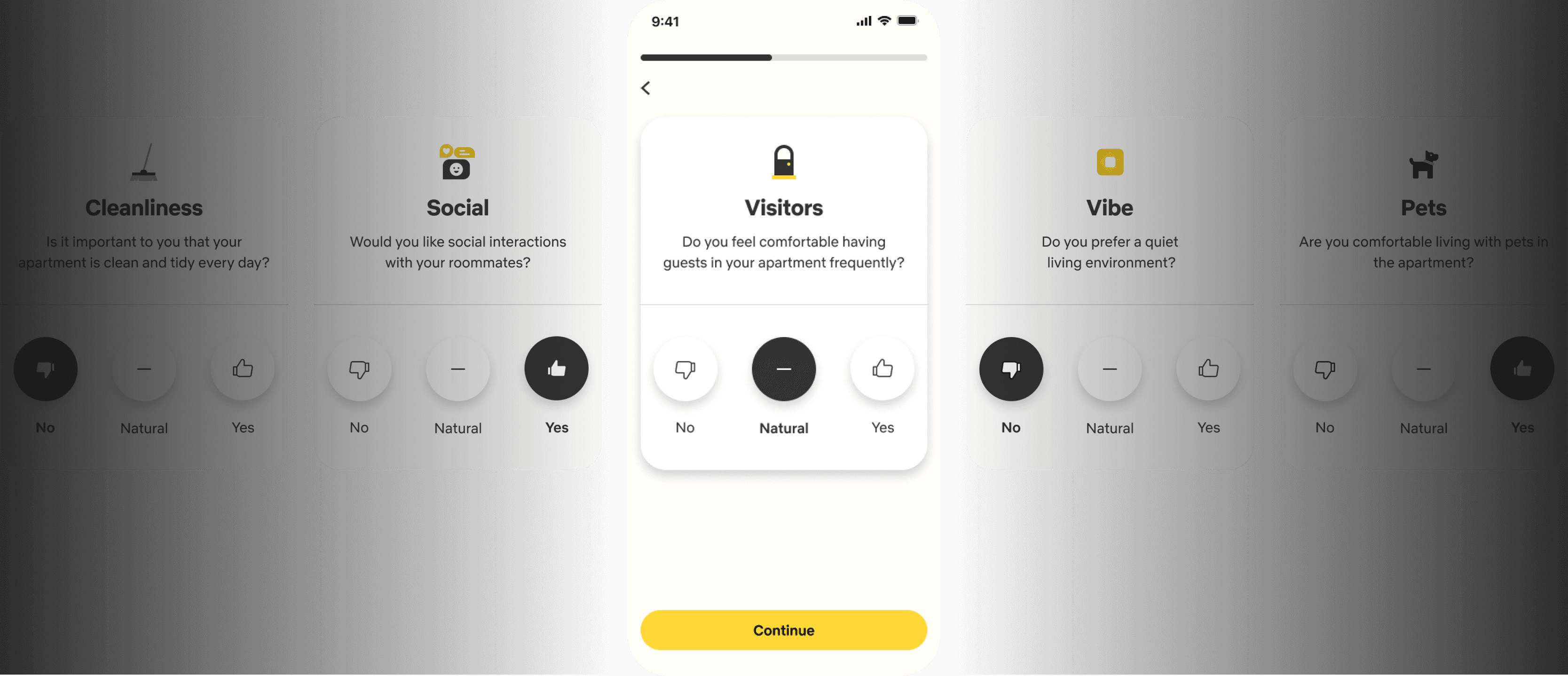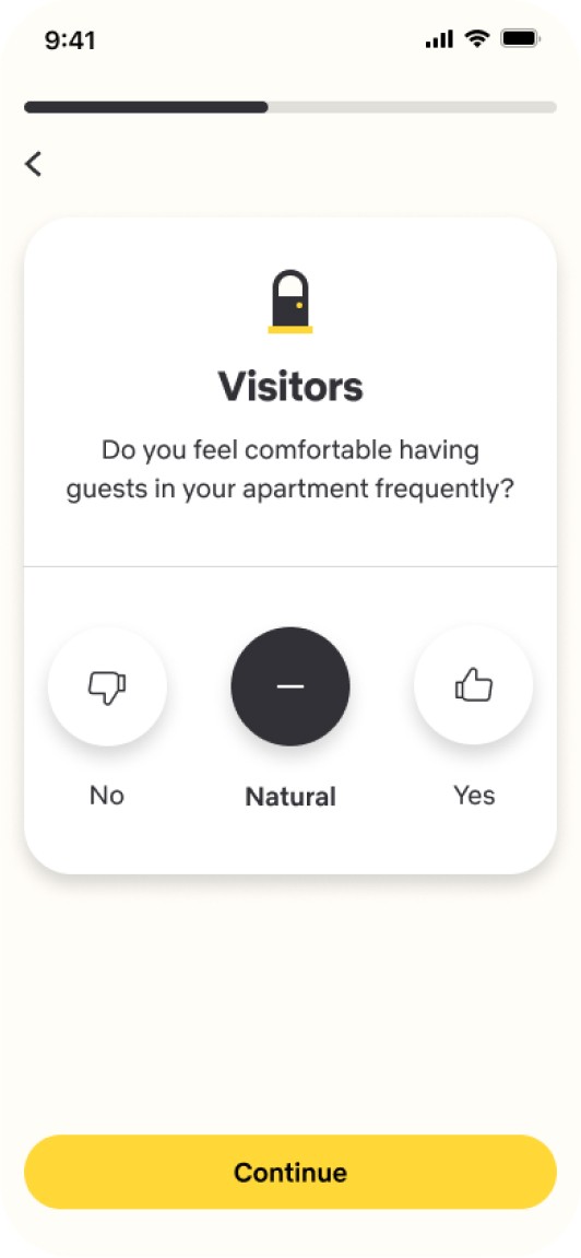 Following the onboarding process, the user will go through a personalization process in which he will answer 8 questions and mark his preferences in order to be matched up with the right roommate.